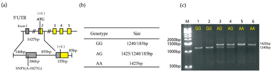 The detailed location of SNP1 (A-1027G) is shown in Figure 6a, and the BanI restriction site was found around it; thus, PCR-RFLP was developed to detect this polymorphism. Two distinct alleles were observed after BanI digestion: (1) allele A-fragment 1425 bp, (2) allele G-two fragments of 1240 and 185 bp (Figure 6b,c; 185 bp is too short to be detectable). Then, allele frequencies were detected in 296 unrelated animals, including Yorkshire (n = 64), Landrace (n = 165), Duroc (n = 37), and Min pigs (n = 30). The genotypes and allele frequency analysis are shown in Table 2. We found that the G allele was predominant in four pig breeds, the AA genotype was not found in either Landrace or Duroc, while Chinese Min pigs only exhibited the GG genotype.