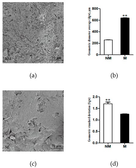 (a) The physical characteristics of non-microencapsulated vitamin form high-resolution scanning electron microscopy. (b) The geometric diameter average (dgw) of NM (non-microencapsulated) and M (microencapsulated) vitamins. (c) The physical characteristics of microencapsulated vitamin form high-resolution scanning electron microscopy. (d) The geometric standard deviation (Sgw) of NM (non-microencapsulated) and M (microencapsulated) vitamins. ** represent p < 0.01.