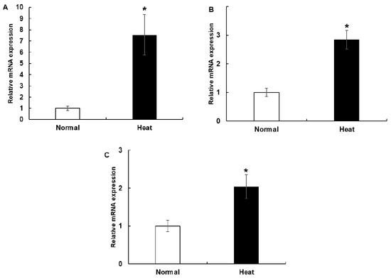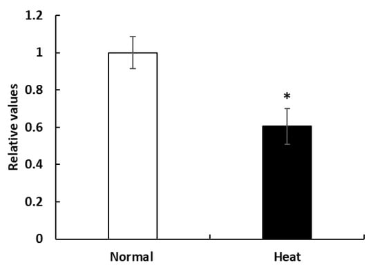 Effects of heat stress on peripheral blood mononuclear cells (PBMCs) proliferation. Cell viability was measured by Cell Counting Kit-8 (CCK-8) assay. Data are presented as the means ± standard errors (n = 5 for each of three experiments). * Means with different superscripts differ significantly (p < 0.05) between two groups based on Student’s t-test.