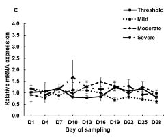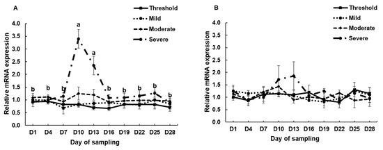 The expression of HSP genes in PBMCs was evaluated in the in vitro experiments (Figure 2). The expression of HSP70 (p = 0.022), HSP90 (p = 0.003) and HSPB1 (p = 0.026) in the heat-stressed PBMCs was significantly higher than in the control group. The expression of HSP genes in PBMCs was evaluated in the in vitro experiments by time course over the total period (28 days; Figure 3). Increased HSP70 was observed after rapid exposure to HS conditions (severe group, p = 0.0014). However, as the HS conditions were maintained, HSP70 expression returned to the normal range after 6 days (day 10 to day 16) implying that adaptation occurred.