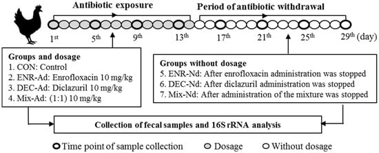 The enrofloxacin and diclazuril were obtained from Qilu Animal Health Products Co., Ltd., Shandong, China (http://en.qiludb.com/product/48.html), and Jiangsu HFQ Bio-Technology Co., Ltd., Beijing, China (https://www.heaftron.com/veterinary-oral-solution/diclazuril-solution.html), respectively. Enrofloxacin at 10 mg/kg body weight (BW), diclazuril at 0.3 mg/kg BW, and a mix of enrofloxacin and diclazuril (1:1) were administered daily for 14 days. The drugs were added to the water boxes in the cages of the first, second, and third experimental groups. Then, we stopped the addition of drugs for another two weeks to obtain three subgroups of withdrawal periods for the drugs. The control group was not given any additives. The additional drugs were stopped after 14 days, at which point all chicks consumed pure water for another 15 days. At the end of the experimental period, all surviving chicks were sacrificed by decapitation. A total of 6 experimental groups were obtained as follows: addition of enrofloxacin (ENR-Ad), no enrofloxacin (ENR-Nd), addition of diclazuril (DEC-Ad), no diclazuril (DEC-Nd), addition of drug mixture (MIX-Ad), and no drug mixture (MIX-Nd), while the seventh group was considered the control group. Each chick from the seven groups was considered as an experimental unit. The fresh fecal samples were collected from the six experimental groups every 3 days at eight time points (4 times with the addition of drugs and 4 times without the addition of drugs), preserved in liquid nitrogen, and used for DNA extraction and PCR amplification. To investigate the impacts of antibiotic exposure on the gut microbiota diversity of chicks, a total of 4 samples were collected into clean tubes under cooling conditions from the ENR-Ad, ENR-Nd, DEC-Ad, DEC-Nd, MIX-Ad, and MIX-Nd groups, as well as 12 samples from the control group, and stored at −20 °C until DNA extraction. The animal experimental design is presented in Figure 1, in which the flowchart demonstrates the selection process for the data included in the analysis (Figure S1).