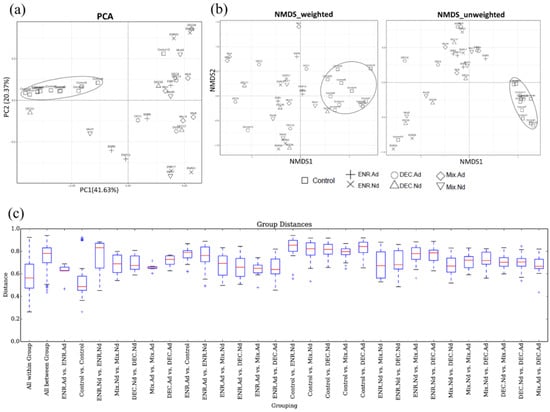 (a) Principal component analysis (PCA), (b) nonmetric multidimensional scaling (NMDS), and (c) boxplot for comparative analysis of intergroup–group differences in UniFrac distance pathways among groups of control and antibiotic-exposed chicks. ENR-Ad: addition of enrofloxacin; ENR-Nd: no enrofloxacin; DEC-Ad: addition of diclazuril; DEC-Nd: no diclazuril; MIX-Ad: addition of drug mixture; MIX-Nd: no drug mixture; CON: control group.