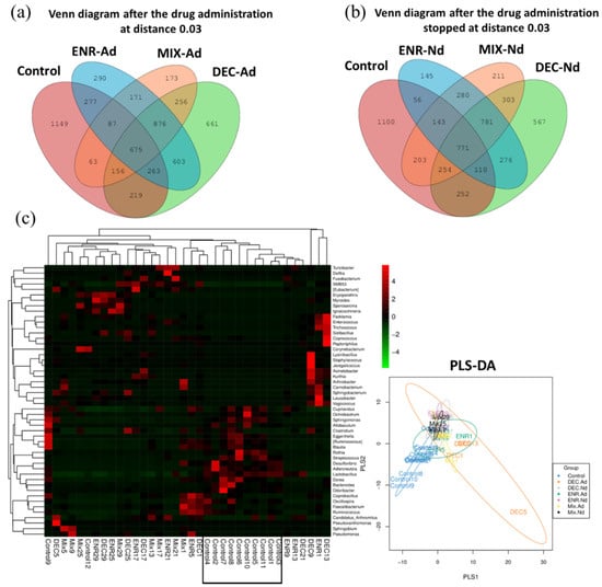 (a,b) Venn diagram of shared OTUs of the different groups during the period of drug administration (2 weeks) and during the period of no drug administration (2 weeks), respectively. The numbers below the groups indicate the number of OTUs within each sector. (c) Heatmap showing the genera with significant differences in relative abundances among the seven groups. Partial least squares discriminant analysis (PlS-DA) among groups of control and antibiotic-exposed chicks. ENR-Ad: addition of enrofloxacin; ENR-Nd: no enrofloxacin; DEC-Ad: addition of diclazuril; DEC-Nd: no diclazuril; MIX-Ad: addition of drug mixture; MIX-Nd: no drug mixture; CON: control group.