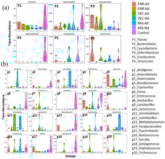 To evaluate the similarity between samples, the unweighted pair-group method with arithmetic (UPGMA) analysis was performed, which indicated that samples of the CON group were mostly similar and distributed into one cluster of hierarchical trees (Figure S4). Moreover, to identify specific bacterial taxa that are associated with the responses of antibiotic-exposed chickens, we compared the fecal microbiota among groups by using LEfSe analysis based on linear discriminant analysis (LDA). A LEfSe cladogram representative of the structure of the host microbiota axis showed a significant shift in the microbiota among groups, including a total of 37 bacterial taxa that were significantly different among the seven groups, especially the Lactobacillus, Streptococcus, Enterococcus, Acinetobacter, and Ruminococcus families (Figure S5). The LDA score plot shows that group-enriched taxa were significant at p < 0.05 (Figure 3b). The abundance comparison among groups at the phylum and genus levels was performed by Metastats analysis (Figure 4). The six phyla of Thermi, Bacteroidetes, Cyanobacteria, Deferribacteres, Fusobacteria, and Tenericutes were the most abundant, with significant differences (p < 0.05) among groups. At the genus level, a total of 20 genera appeared, with significant differences (p < 0.05) among groups, including Amycolatopsis, Dorea, Geobacillus, Methylobacterium, Serratia, and Sphingomonas, which had the greatest differences compared with the CON group (Figure 4). In addition, the statistical results of the Metastats comparison tests between each group are presented in Table S3. The highest variation (5 phyla and 40 genera) was recorded between CON and ENR.Nd, whereas only one genus appeared in the comparison between DEC.Nd and Mix.Nd groups (Table S3).