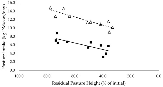 The relationship between pasture intake (kg DM/cow/day) and residual pasture height (% of initial) for high (■) and low (Δ) mixed ration levels. Lines were fitted for high (solid) and low (dashed) mixed ration levels.