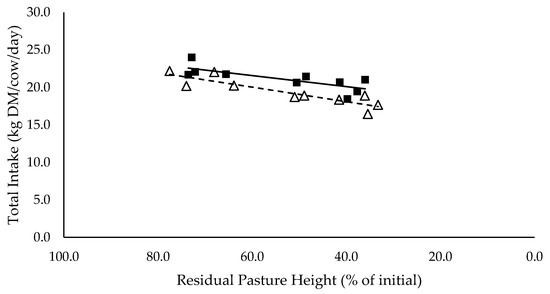 The relationship between total intake (kg DM/cow/day) and residual pasture height (% of initial) for high (■) and low (Δ) mixed ration levels. Lines were fitted for high (solid) and low (dashed) mixed ration levels.