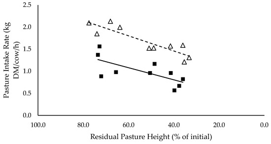 The relationship between pasture intake rate (kg DM/cow/h) and residual pasture height (% of initial) for high (■) and low (Δ) mixed ration levels. Lines were fitted for high (solid) and low (dashed) mixed ration levels.