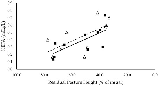 The relationship between the serum non-esterified fatty acid (NEFA) (mEq/L) and residual pasture height (% of initial) for high (■) and low (Δ) mixed ration levels. Lines were fitted for high (solid) and low (dashed) mixed ration levels.