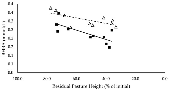 The relationship between the serum β-hydroxybutyrate (BHBA) (mmol/L) and residual pasture height (% of initial) for high (■) and low (Δ) mixed ration levels. Lines were fitted for high (solid) and low (dashed) mixed ration levels.