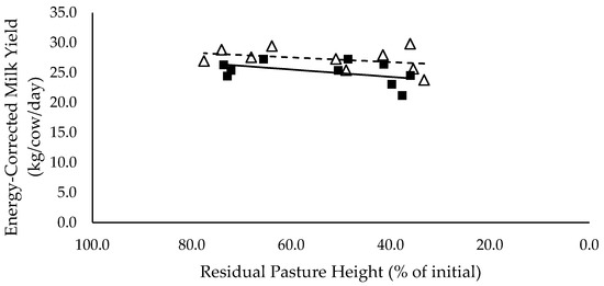 The relationship between energy corrected milk yield (kg/cow/day) and residual pasture height (% of initial) for high (■) and low (Δ) mixed ration levels. Lines were fitted for high (solid) and low (dashed) mixed ration levels.