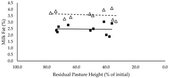 The relationship between milk fat (%) and residual pasture height (% of initial) for high (■) and low (Δ) mixed ration levels. Lines were fitted for high (solid) and low (dashed) mixed ration levels.