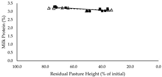 The relationship between milk protein (%) and residual pasture height (% of initial) for high (■) and low (Δ) mixed ration levels. Lines were fitted for high (solid) and low (dashed) mixed ration levels.
