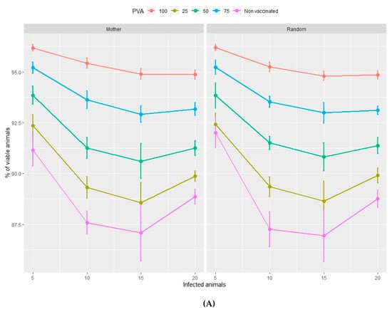Percentage of viable animals (A) and percentage of total weight loss (B) at the end of the fattening period in relation to the type of management (mother or random), the percentage of vaccinated animals (PVA—ranging from 0%–100% of the population) and the percentage of infected animals at the time of vaccination. Orderly movements of piglets consists of allocating them to nursery pens according to the identity of their mothers and then filling the fattening pens according to the same nursery distribution (Mother) c.f. random movements whereby piglets are allocated to both nursery and fattening pens at random (Random).