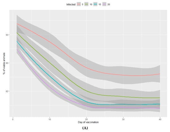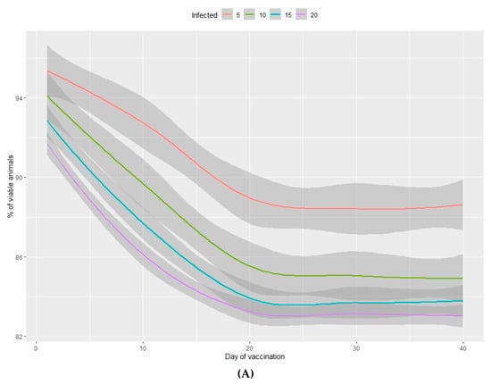The percentage of viable animals produced and the loss of total weight at the end of the production period are shown in Figure 3A,B (nursery phase) and Figure 4A,B (fattening phase) in relation to the percentage of infected animals at the beginning of the nursery period (time of infection) and the lag time before vaccination of 100% of the population. In all cases, the higher the percentage of infected animals at the beginning of the nursery phase, the worse the production performance during the rearing period. Moreover, the earlier the vaccine is administered in the population, the better the production performance obtained during the nursery and fattening phases. Even a one-day delay in administering the vaccine can result in a loss of 0.2% of animals daily and a consequent loss of total weight at the end of the nursery phase. A 10-day delay in administering the vaccine implies a 5% decrease in animals remaining at the end of the fattening phase, when the starting point is 5% of sick animals. When 20% of animals are sick, the losses can reach 10% and can vary from 2%–7%, depending on the animals infected. When the vaccine is administered later than 20 days after diagnosing the disease, there is no observed significant improvement in any of the measured variables.
