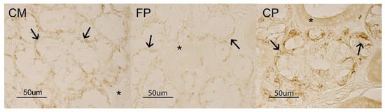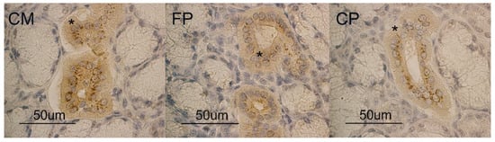 As for the other immunohistochemical treatments, pig mandibular acini did not react to AQP5 antibody. On the contrary, demilunes showed a weak positivity in CM and FP samples, which became strong in the CP diet samples. Additionally, in the CP diet, a slight AQP5 positivity was seen in the ducts, above all at cell coat level (Figure 3).