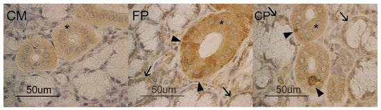 Pig mandibular gland. AQP5 binding sites at duct (*) and demilune (↑) level in CM, FP and CP groups.