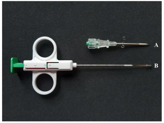 SuperCore TM Biopsy Instrument (B) (14 G × 9 cm) with Co-Axial Introducer Needle (A) (13 G × 3.9 cm). The biopsy needle has two tension points to pre-tension it, as the numbers 0, 1, and 2 illustrate. In the present study, tension was applied up to the second (2) tension point. At the tip of the biopsy needle (B) is the recess where the tissue sample can be found after the plunger has been pressed.