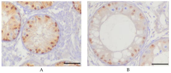 In order to verify the method of SC counting described above, immunohistochemistry (IHC) was performed on Bouin-fixed paraffin embedded sections. In mice and rats, it was described that SOX9 staining reliably stains the SC nuclei so that they contrast clearly with adjacent germ cells [20]. This characteristic was also observed in bulls [21] (Figure 2A,B).