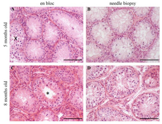 Needle biopsy has been advocated as an instrument for fertility status examination in different species [1,2]. As the effects of the biopsy on patients are discussed elsewhere (men: [3]; stallions: [4]; bulls: [2,5]), this study focused on the histological comparability of needle biopsy samples versus en bloc samples as well as on the validity of a single biopsy for both whole, physiologically developed testes.