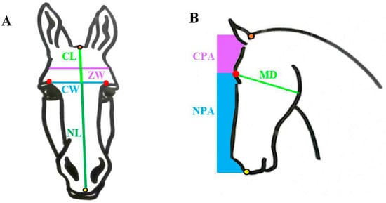 Diagram of the various measurements taken from horse (n = 14) and donkey (n = 16) skulls. The orbital notch is marked by the red dot. The occipital crest is marked by the orange dot, and the incisive bone is marked by the yellow dot. (A): The frontonasal suture line is estimated by a horizontal line joining the left and right orbital notches to determine cranial width = CW blue line. Cranial length = CL light green line; nasal length = NL dark green line; zygomatic width = ZW purple line. (B): mandibular depth = MD green line, nasal profile area = NPA blue area, cranial profile area = CPA purple area. See text for details of each measure.