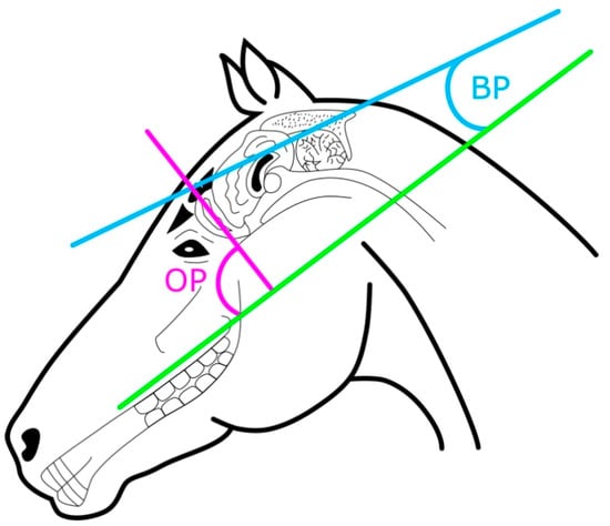Diagram of brain measurements on horse (n = 14) and donkey (n = 16) skulls. The olfactory pitch (OP) was measured as the angle between the hard palate (green line) and the longitudinal axis of the olfactory bulb (purple line). The brain pitch (BP) was measured as the angle between the hard palate and the longitudinal axis of the brain (blue line).