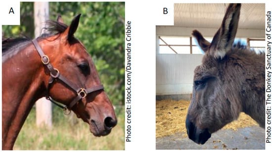 Horses and donkeys belong to the same family of Equidae. However, within the genus Equus, there are clear variances in anatomical structure and behaviour of the various species. While donkeys and Standardbred racehorses both typically exhibit convex nasal profiles, the physiology and behaviour of these two equids is markedly different. Donkeys, evolving from arid climates, are more affected by intemperate weather than horses, but are less reactive to biting insects []. Donkeys can thrive on lower quality forage than horses, but this also puts them at risk for metabolic diseases when donkey owners feed them like horses [,,]. While horses show more obvious behavioural responses to pain than donkeys [,], both donkeys and mules show more metabolic changes indicative of stress than horses when subjected to transportation and mixing at auction houses [].