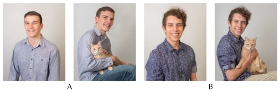 Photos presented to survey respondents. A. Male 1 alone and with cat. B. Male 2 alone and with cat.