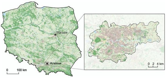 The study was carried out in Krakow (50°03′4″ N, 19°56′1″ E), the second largest city in Poland, with a population of 775,000 in 2019 [53]. From west to east the city is crossed by the Vistula River, the largest Polish river, and its tributaries [54] (Figure 1).