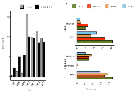 The occurrence of human-wildlife conflicts (HWC) in Krakow city between September 2007 and December 2013. (A) The annual frequency (percentage) of HWC incidents for birds and mammals. (B) The seasonal variation of the number of intrusions, damage and animal-vehicle collision (AVC) incidents among birds and mammals.