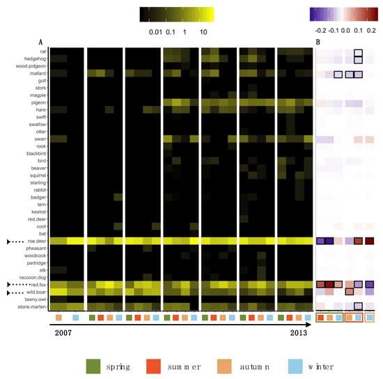 The heat map of HWC for all animals across seasons in different years showed that roe deer, red fox and wild boar were the most abundant species, appearing in all seasons throughout the years (Figure 3A).