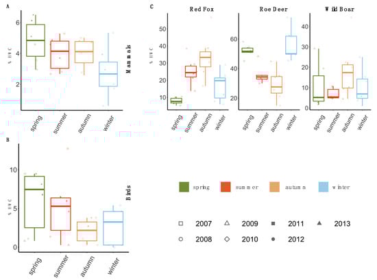 Box plot showing a seasonal variation of human-wildlife conflicts (HWC) for mammals and birds. Box: middle 50% of the data (25th–75th percentile); horizontal line: median; dots: outliers (A) shows overall seasonal variation for mammals. (B) shows overall seasonal variation for birds computed using the linear model considering year as a random factor. (C) depicts a seasonal variation of red fox, roe deer and wild boar. The colours represent the seasons and the shapes represent corresponding years.