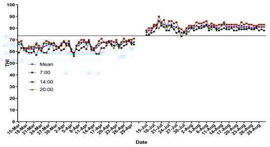 Temperature–humidity index at 07:00, 14:00, and 20:00 h, and mean.