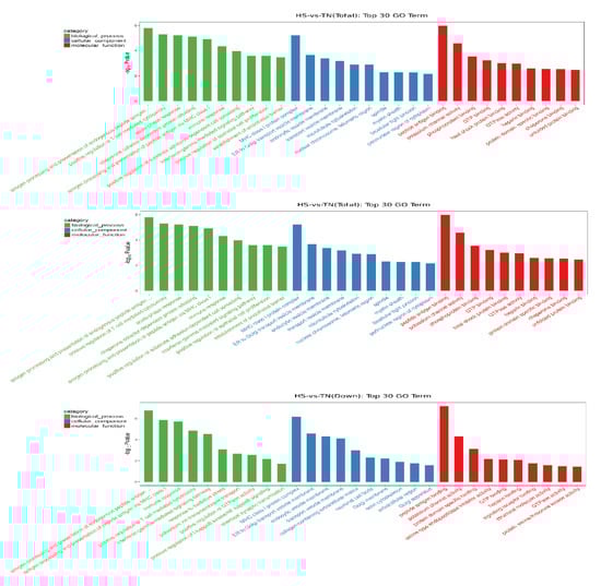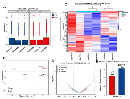 An average of 49.30 million raw reads was generated from TN and HS libraries. After filtering out low-quality sequences, we had 47.4 to 48.76 million total tag numbers per library. High-quality (Q > 30) reads accounted for 95.27–96.04% of the reads and the GC percentage of each library ranged from 46.90% to 49.24% (Supplementary Materials Table S2). In order to evaluate the transcript profiling data, principal component analysis (PCA) was applied to capture the overall variance among the samples in two dimensions (Figure 2B). The principal component analysis illustrated that a significant difference existed between the TN and HS groups. Two hundred and thirteen DEGs were identified, among which 89 were upregulated and 124 downregulated (Figure 2E). The DEG profiles in six samples are shown in Figure 2C,D.