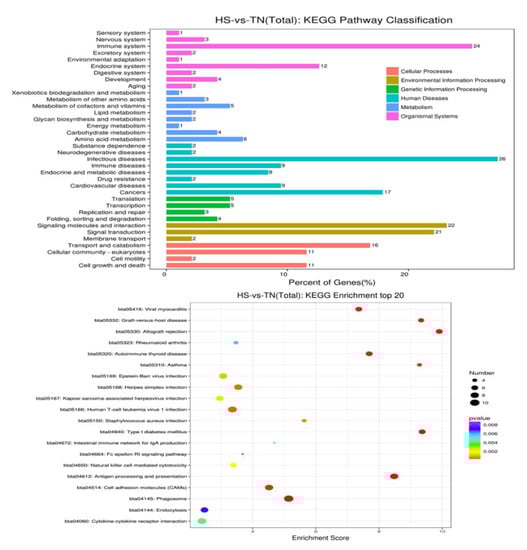 The top-20 pathways of HS-vs.-TN (total) of Kyoto Encyclopedia of Genes and Genomes enrichment.