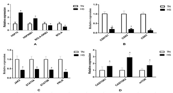 The relative expression of heat shock and immune response genes (A), casein genes (B), JAK/STAT5 pathway genes (C), and mTOR pathway genes between both TN and HS groups (D). * p < 0.05 vs. TN group.