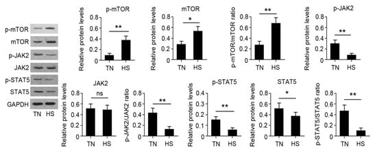 The results of qRT-PCR are presented in Figure 5. Results revealed that fourteen genes were significantly affected by HS. RNA-seq results showed that HSP70 and HSP90B1 were upregulated while BoLA and BoLA-DRB3 were downregulated in the HS group. Moreover, HS decreased the gene expression of CSN1S1, CSN2, CSN3, PRLR, STAT5A, STAT5B, and JAK2, while HS increased the gene expression of CASTOR1, CASTOR2, and mTOR. The change was also consistent with that of their total protein products (Figure 6). The phosphorylation of mTOR was increased while the phosphorylation of JAK2 and STAT5 was decreased in the HS group.