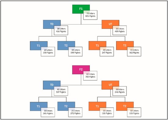 Scheme of observations. In the study, a total of 134 litters (1608 piglets) were assessed on two farms (F1, F2). The piglets on each farm were assessed on two different age (T1 = 7 days; T2 = 20 days of age). On each farm, there were litters with undocked (UT) and docked tails (TD). Tail docking was performed without local anaesthesia within the first week of life.