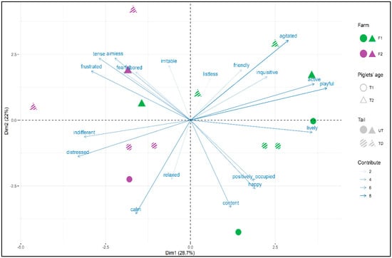 On average, the QBA score was 32.1 (±24.4). The QBA score significantly differed between F1 and F2 (44.3 vs. 16.1, p < 0.0001), which indicated a more positive emotional state in F1. A higher score was also found in T1 compared to T2 (31.2 vs. 24.5, p = 0.0002), indicating a worse emotional state at the age of 20 days as compared to 7 days. Piglets who did not receive tail docking showed a higher QBA score as compared to TD piglets (31.2 vs. 24.5, p = 0.01). The two first components were retained from the PCA, explaining 28.7% and 22.0% of the total variation of QBA score (Figure 2, File S2). Dimension 1 (Dim 1) was characterised by descriptors of valence in the emotional state, and ranged from active and lively (eigenvalue 0.8) to distressed (eigenvalue −0.7), while Dimension 2 (Dim 2) was, for the most part, characterised by descriptors related to arousal, ranging from agitated (eigenvalue 0.7) to calm (eigenvalue −0.8), even if the cluster was less clear. The farms clustered clearly, and they differed by their loading in Dim 1. In fact, F2 piglets had a negative score on Dim 1, signifying that they were perceived as more tense, aimless, frustrated, distressed and indifferent than those on F1, on which the piglets were more active, playful, lively, happy and content. Piglets’ age clustered in Dim 2 signifying that the T2 piglets were perceived as having more high arousal (agitated, active, playful, fearful) than the T1 piglets. Tail docking did not cluster in any of the dimensions, showing that this factor did not differ in its expression of valence nor arousal.
