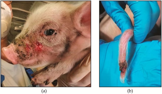 - Reiner, G.; Lechner, M.; Eisenack, A.; Kallenbach, K.; Rau, K.; Müller, S.; Fink-Gremmels, J. Prevalence of an inflammation and necrosis syndrome in suckling piglets. Animal 2019, 13, 2007–2017. [Google Scholar] [CrossRef]