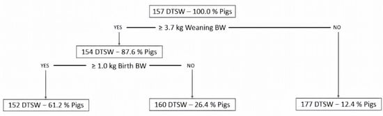 Regression tree analysis used to estimate cut-off values for birth and weaning BW to identify slow growing pigs within a batch. Model included the days to target slaughter weight (DTSW; i.e., 110 kg of BW) as the outcome variable, and birth body weight and weaning body weight as predictor variables. Pigs with body weight lower than 3.7 kg of BW at weaning (i.e., 28 days of age) would be considered slow growing pigs. Regression tree analysis was performed using the rpart package [26] of R v3.5.2 [27].