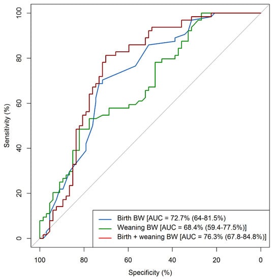 Cut-off values for birth and weaning BW were estimated to identify pigs that would reach target slaughter weight at 22 weeks of age. The AUC for the three models ranged from 68.4% (weaning BW as predictor) to 76.3% (birth BW plus weaning BW as predictors), and they were all significantly different from 0.5 (Table 4). The optimal cut-off value for the predictor variables and their associated sensitivity and specificity are also shown in Table 4. When comparing ROCs, no difference was observed between the AUC of the three models (p > 0.05). ROCs are shown in Figure 2.