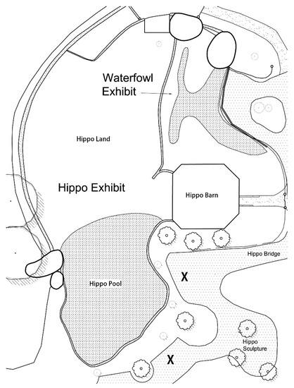 Hippo exhibit, with the two observational areas a hippo could be during the study (hippo pool and hippo land), observation points for all behavioral observations (marked ‘X’), and the indoor hippo barn (night enclosure) and surrounding areas.