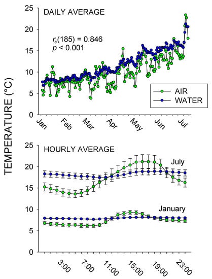 Average daily water and land temperature (top graph) and the average hourly water and land temperature (with standard error of the mean bars [SE]; bottom graph) for January vs. July. The water temperatures are the combined surface + deep water temperatures recorded. Spearman’s rs is reported for the correlation between daily air and water temperatures during the entire study (January–July; n = 187 days).