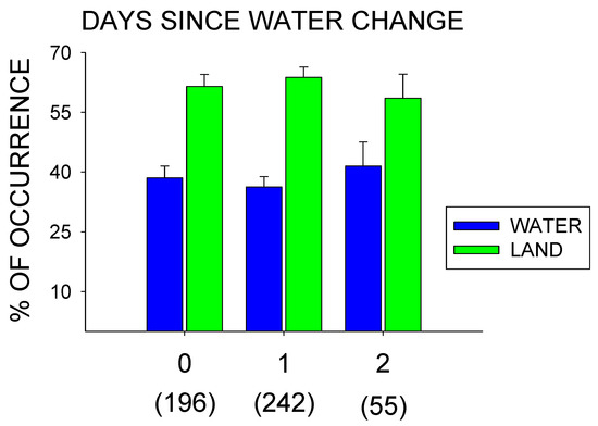 Percentage of water vs. land use (with standard error of the mean bars [SE]) based on the days since a water change (0, 1, or 2 days) for the total observations (n = 493) during the entire study (January–July). Number of observations for each condition are listed in the parentheses below each condition.
