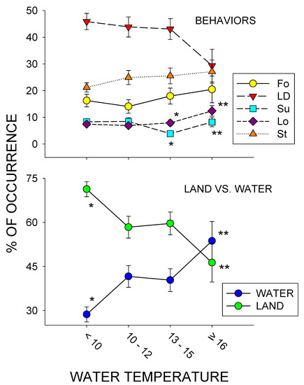 Percentage of activity (with standard error of the mean bars [SE]) for the 5 most frequently occurring responses (Lying Down (LD), Standing (St), Foraging (Fo), Locomotion (Lo) and Submerged (Su); top graph) and for water vs. land use (bottom graph) across four different water temperature conditions (<10, 10–12, 13–15, and ≥ 16 °C) for the entire study (January–July). Both graphs include standard error of the mean bars, with * and ** indicating significant differences within each category (e.g., * to ** = water use between <10 and ≥16 °C) across the different temperature conditions (p < 0.05).