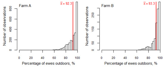 Ewes spent slightly less time outdoors at night on both farms (from midnight until 6.00–7.00 a.m.) compared to the daytime (from 9 a.m. until 6.00–7.00 p.m.). On Farms A and B, respectively, 88 and 91% of ewes chose to stay outdoors at night. From 13.00 to 18.00 on Farm A and 9.00 to 22.00 on Farm B there were always more than 70% of ewes choosing to be outdoors (Figure 2).