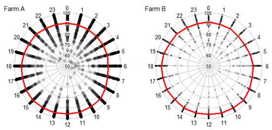 As a result of the survey, a database was created for Farm A, which contained 28 observation days for 2017 (from 30th March–26th April), during which there were a total of 646 observations. For 2018, the survey in Farm A contained data for 91 observation days (from 16th January–May 4th), during which 1888 observations were made. Due to technical issues, observations were not carried out in 2018 during the period of 17–25 January and 28 March–4 April. On Farm B, the observations were carried out for 49 days in 2018 (from 6th March–23rd April), during which 1144 observations were made. The total number of observations included in the database file was 3678 for the two farms over two years (Table S1).