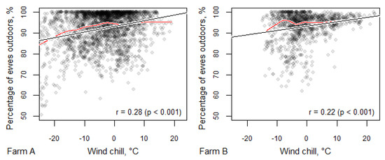 Percentage of ewes outdoors dependent on wind chill. One point corresponds to one photograph, black lines denote the linear relationship (corresponding correlation coefficients with p-values are presented in the lower right corners of the figures) and the red lines indicates the potential non-linear relationship fitted with a locally weighted scatterplot smoothing (LOWESS) curve.