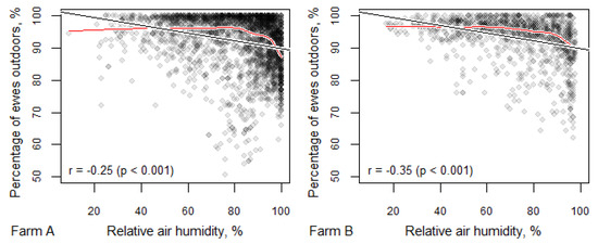 Percentage of ewes outdoors dependent on relative air humidity. One point corresponds to one photograph, black lines denote the linear relationship (corresponding correlation coefficients with p-values are presented in the lower left corners of the figures) and the red lines indicate the potential non-linear relationship fitted with a locally weighted scatterplot smoothing (LOWESS) curve.