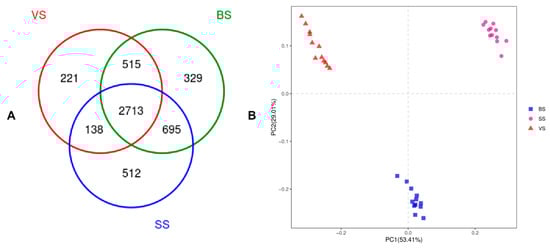 Differences in bacterial community richness and operational taxonomic units (OTUs) in different phenological periods. (A): Venn diagram showing the different and similar OTUs in different phenological periods; (B): Principal coordinate analysis (PCoA) of the yak ruminal microbiota in different phenological periods. The PCoA plots were constructed using the unweighted Unifrac method. VS: Vegetative stage, BS: Bloom stage, SS: Senescent stage.